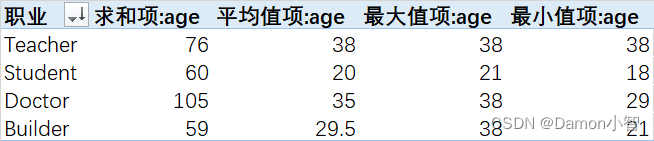 /* SQL里的表达: 按照用户职业分组,查出每个分组的人数及各组的年岁最大值、最小值、平均值和总和 */
