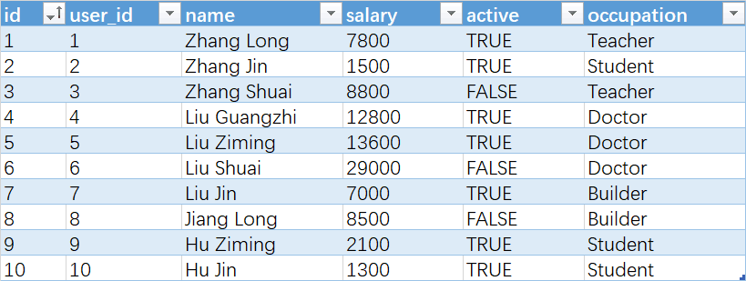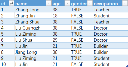 [{id = 11, name = Zhang San, age = 21, gender = False, occupation = Doctor},