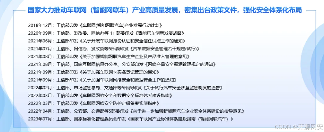自 2015 年以来,国务院、工业和信息化部、交通运输部、科学技术部、国家发展改革委、公安部等部委相继出台一系列顶层规划及政策文件,车联网安全发展取得阶段性成效。出台《汽车产业中长期发展规划》《车联网(智能汽车)产业发展行动计划》《智能汽车创新发展战略》等引导性文件,在宏观引导智能网联汽车产业稳步发展,并将智能网联汽车网络安全和数据安全作为一项重要目的和工作重点。