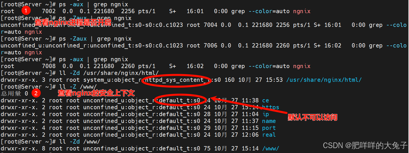 - 以上两个文件的角色字段都是object_r,代表都是文件,/usr/sbin/httpd属于httpd_exec_t类型,/var/www/html/则属于httpd_sys_content_t类型。