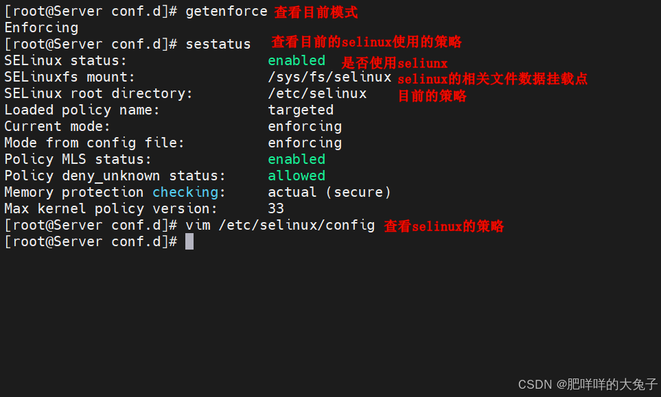 - permissive:宽容模式,代表SELinux正在运行中,不外仅会有告诫信息并不会现实限制domain/type的访问。