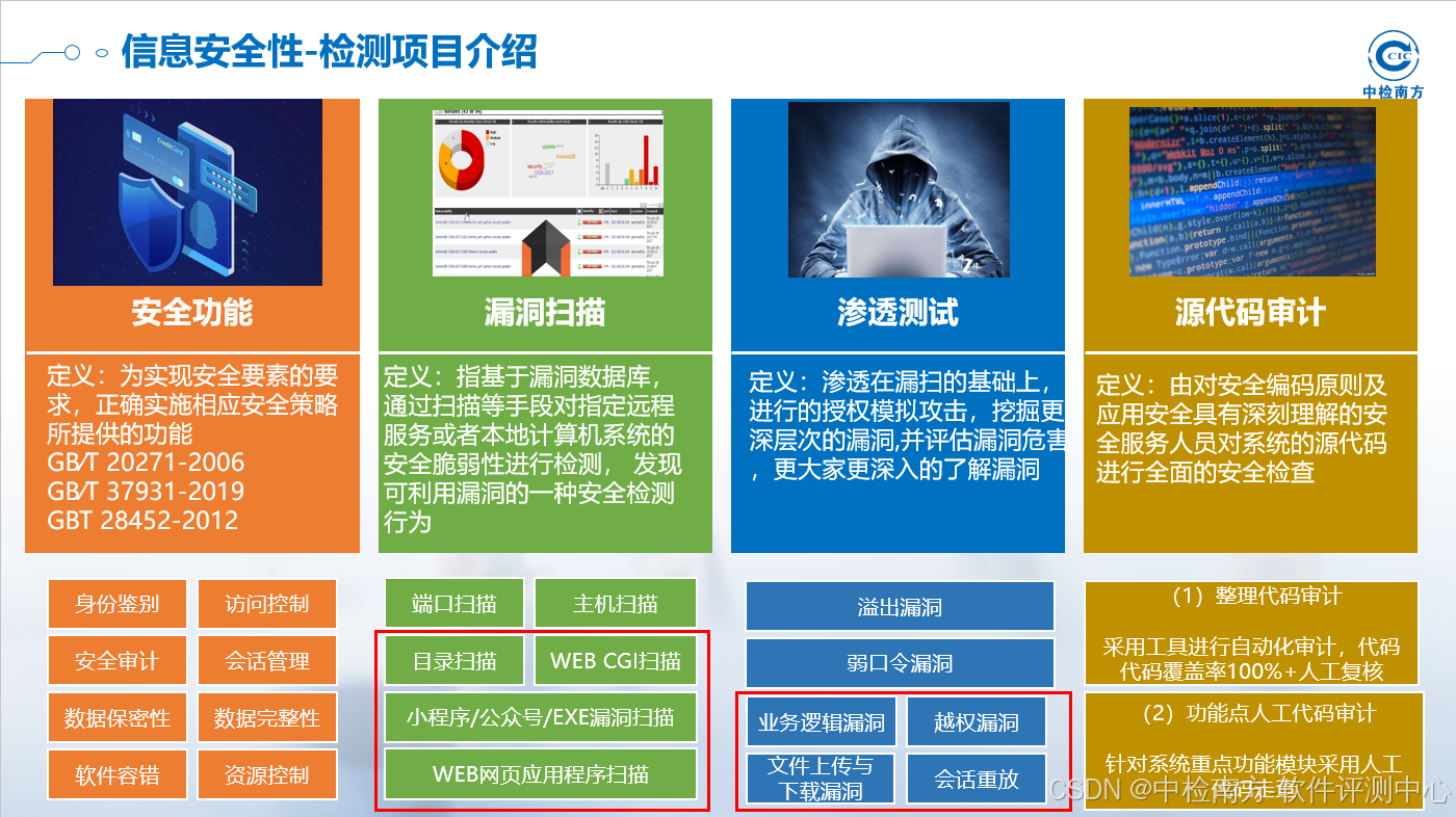 信息安全性检测:安全功能测试、漏洞扫描、渗出测试和源代码检查,帮助企业、社会提高软件的安全性。