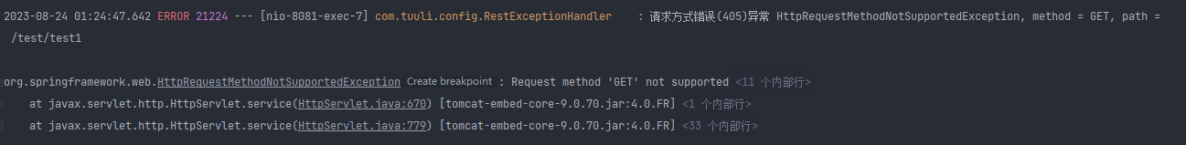 同理我们还可以为405错误进行配置,405错误对应的异常为HttpRequestMethodNotSupportedException- /**