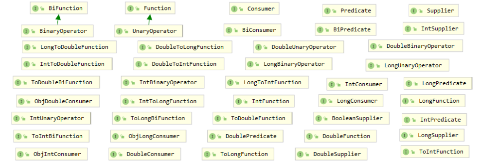 接口类功能描述Runnable直接执行一段处理函数,无任何输出参数,也没有任何输出结果。Supplier执行一段处理函数,无任务输入参数,返回一个T类型的结果。与Runnable的区别在于Supplier执行完之后有返回值。Consumer执行一段处理函数,支持传入一个T类型的参数,执行完没有任何返回值。BiConsumer与Consumer类型相似,区别点在于BiConsumer支持传入两个不同类型的参数,执行完成之后依旧没有任何返回值。Function执行一段处理函数,支持传入一个T类型的参数,执行完成之后,返回一个R类型的结果。与Consumer的区别点就在于Function执行完成之后有输出值。BiFunction与Function相似,区别点在于BiFunction可以传入两个不同类型的参数,执行之后可以返回一个结果。与BiConsumer也很类似,区别点在于BiFunction可以有返回值。UnaryOperator传入一个参数对象T,允许对此参数进行处理,处理完成后返回同样类型的结果对象T。继承Function接口实现,输入输出对象的类型相同。BinaryOperator允许传入2个相同类型的参数,可以对参数进行处理,最后返回一个仍是相同类型的结果T。继承BiFunction接口实现,两个输入参数以及最终输出结果的对象类型都相同。Predicate支持传入一个T类型的参数,执行一段处理函数,最后返回一个布尔类型的结果。BiPredicate支持传入2个相同类型T的参数,执行一段处理函数,最后返回一个布尔类型的结果。JDK中 java.util.function 包内预置了这么多的函数式接口,很多场景下其实都是给JDK中其它的类或者方法中使用的,最典型的就是Stream了——可以说有一大半预置的函数式接口类,都是为适配Stream相关能力而提供的。也正是基于函数式接口的配合使用,才是使得Stream的灵活性与扩展性尤其的突出。