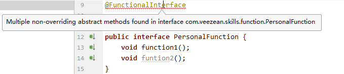 我们自己定义一个函数式接口,里面提供两个抽象方法测试一下,会发现IDEA中直接就提示编译失败了: