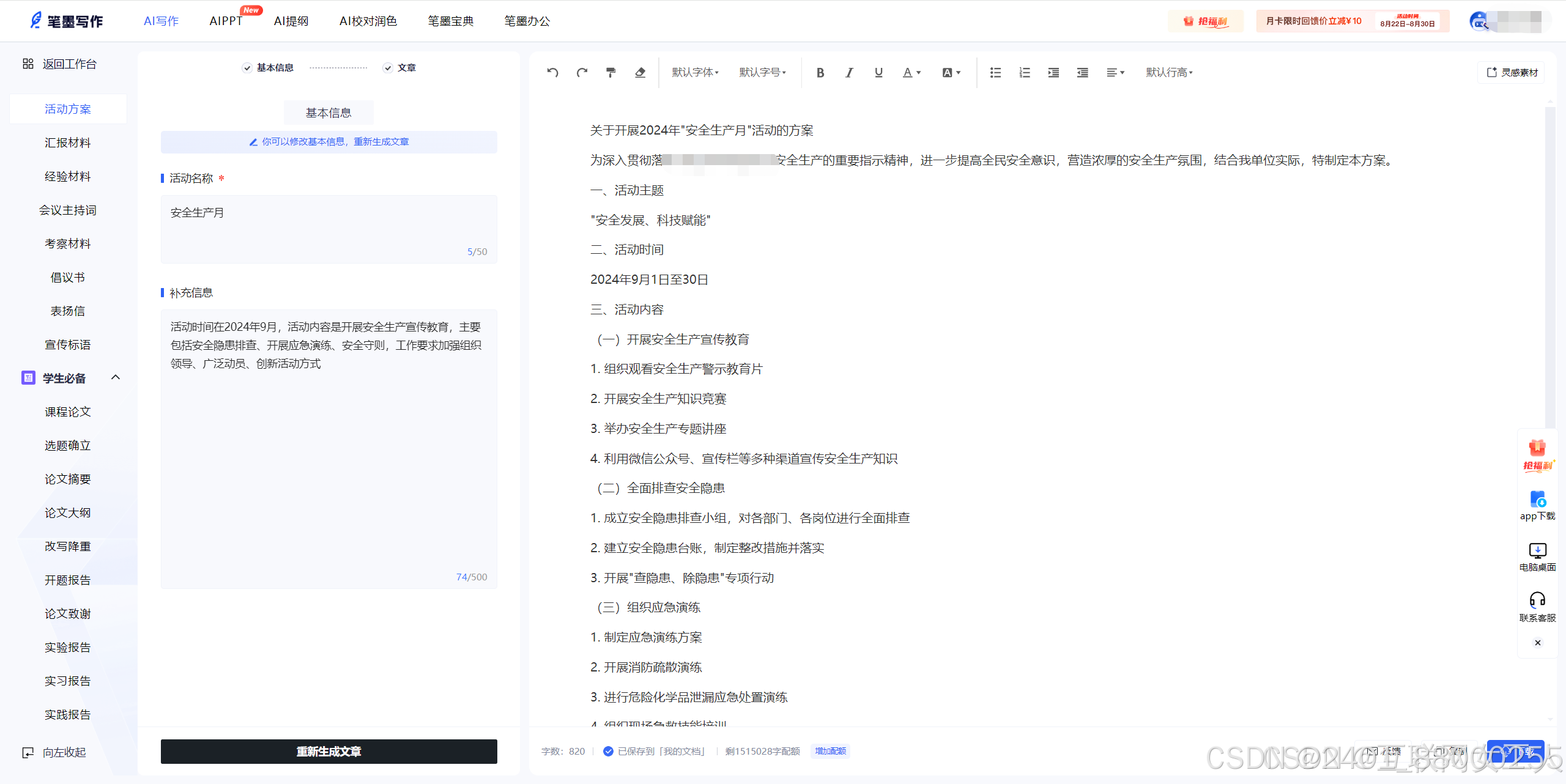 AI智能写作:根据用户需求,智能选择合适的文稿类型和写作场景,快速生成文章草稿。