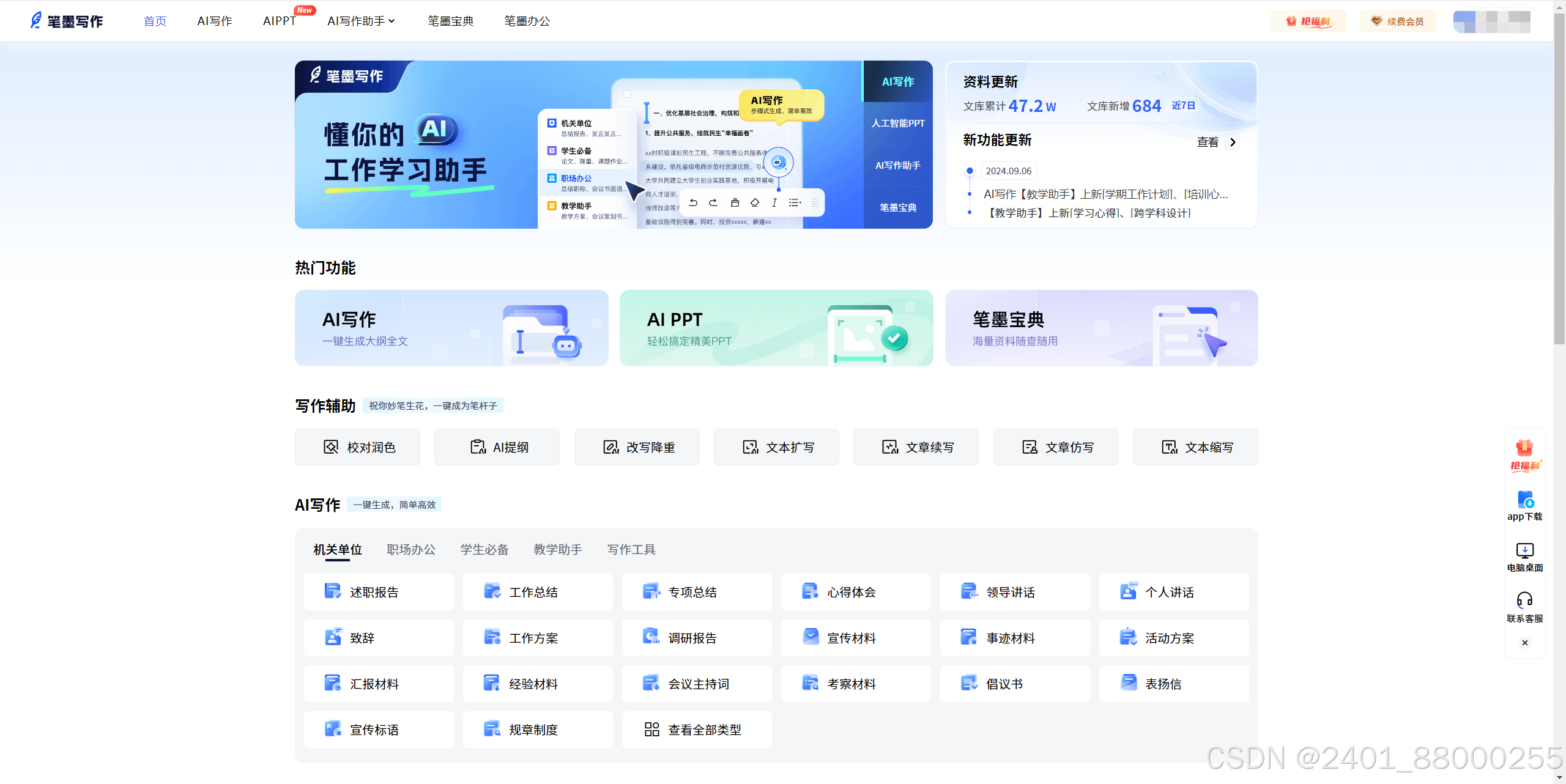 网站功能:AI写作、AIPPT、AI校对润色、笔墨宝典(提供专项集会、党纪学习教诲、党建/党课专题、总结陈诉、心得体会、筹划方案等范文素材和PPT模版)、笔墨办公(提供各种PDF编辑转换工具)