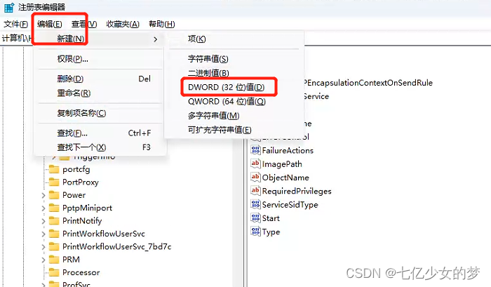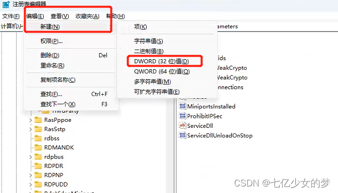 点击:编辑-->新键-->dword