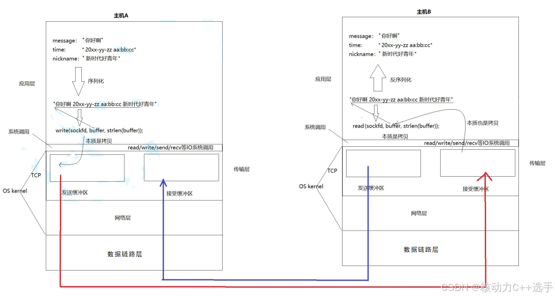 发数据的本质是从发送方的发送缓冲区的内容经过协议栈和网络拷贝给接收方的接收缓冲区。