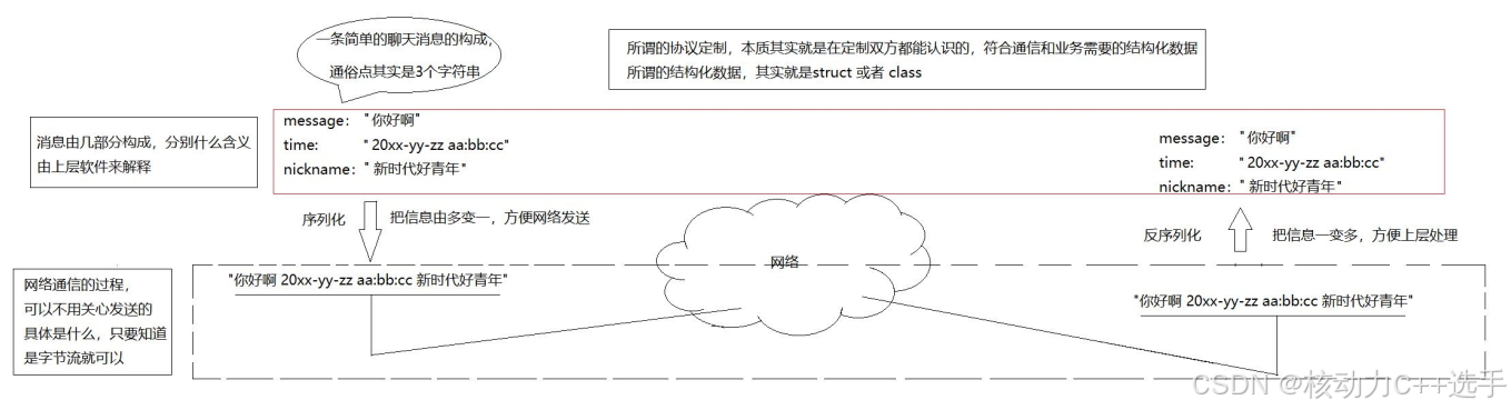 现实上我们在聊天的时候,一条消息由多行构成,包括消息内容、发送时间、用户名等。在发送消息时,为了便于发送,必要举行序列化,把信息由多变一,酿成一行字符串,方便网络发送。然后通过网络,将这一行字符串推动到服务器,然后在客户端把一行字符串按照协议反序列化为结构化的数据,在上层就可以拿到message里的每一个内容。