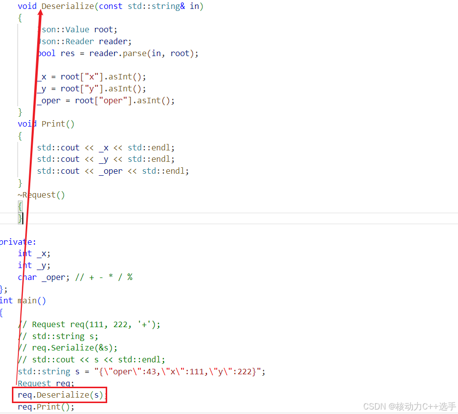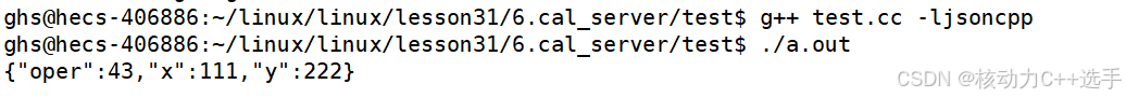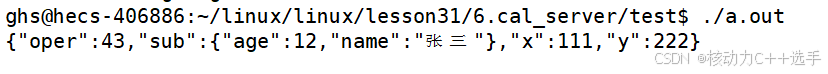 在main函数中:复制代码#pragma once#include "Protocol.hpp"#include <memory>class NetCal{public:    NetCal()    {    }    ~NetCal()    {    }    std::shared_ptr<Response> Calculator(std::shared_ptr<Request> req)    {        auto resp = Factory::BuildResponseDafault();        switch (req->Oper())        {        case '+':            resp->_result = req->X() + req->Y();            break;        case '-':            resp->_result = req->X() - req->Y();            break;        case '*':            resp->_result = req->X() * req->Y();            break;        case '/':        {            if (req->Y() == 0)            {                resp->_code = 1;                resp->_desc = "div zero";            }            else            {                resp->_result = req->X() / req->Y();            }        }        break;        case '%':        {            if (req->Y() == 0)            {                resp->_code = 2;                  resp->_desc = "mod zero";            }            else            {                resp->_result = req->X() / req->Y();            }        }        break;        default:        {            resp->_code = 3;            resp->_desc = "illegal operation";        }        break;        }        return resp;    }};