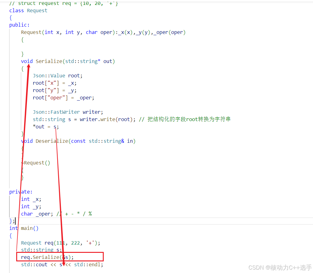 在Request中,客户端将来要将请求发给别人,因此要序列化。服务器也要读到请求,因此要反序列化。在Response中,服务器要发相应给客户端,因此要序列化。客户端要读到相应,因此要反序列化。复制代码//struct request req = {10, 20, '+'}struct request{    int x;    int y;    char oper; // + - * / %};struct response{    int result;    int code; // 0:success 1:div zero 2:非法操作};