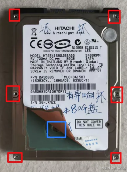 与此同时你可以先尝试卸下金属壳,假如发现无法卸下,那么很大概是硬盘信息的白色卡片遮住了,你须要想我如许撕下来,找到对应的螺丝卸下来(下图蓝色框)