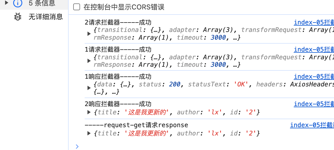 当有多个拦截器, 请求拦截器最反面的先执行(倒序), 响应拦截器按最开始的先执行,反面的后执行(顺序);- // 添加请求拦截器