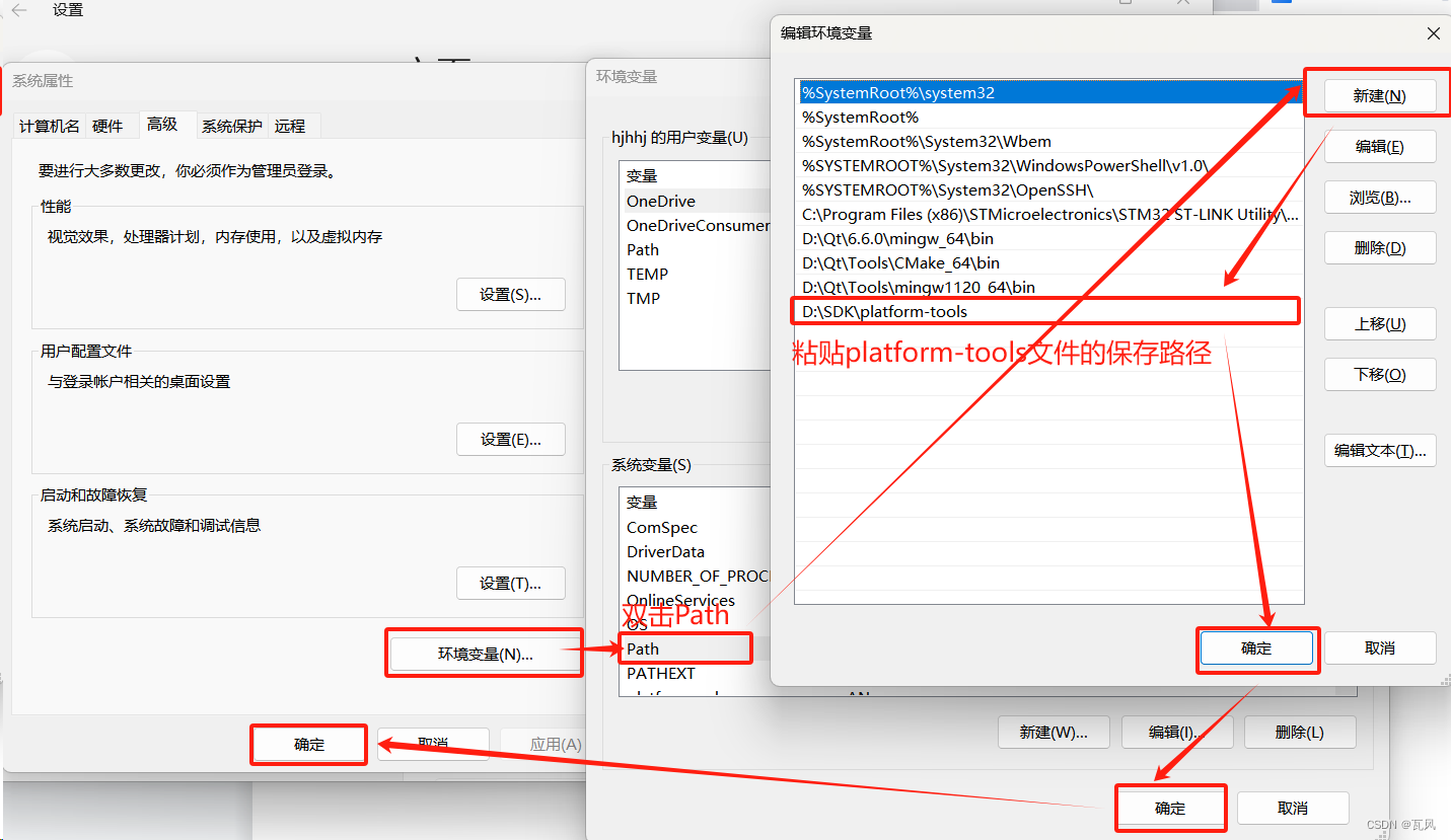 5、在系统属性界面-点击”环境变量”-双击”Path”-”新建”-粘贴”platform-tools文件路径”-”确定”-”确定”-”确定”