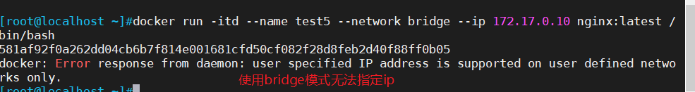 docker run -itd --name test5 --network bridge --ip 172.17.0.10 nginx:latest /bin/bash