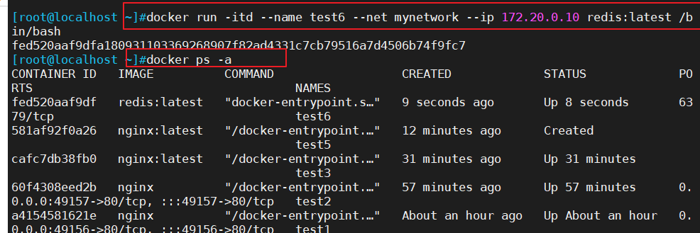 docker run -itd --name test6 --net mynetwork --ip 172.20.0.10 redis:latest /bin/bash