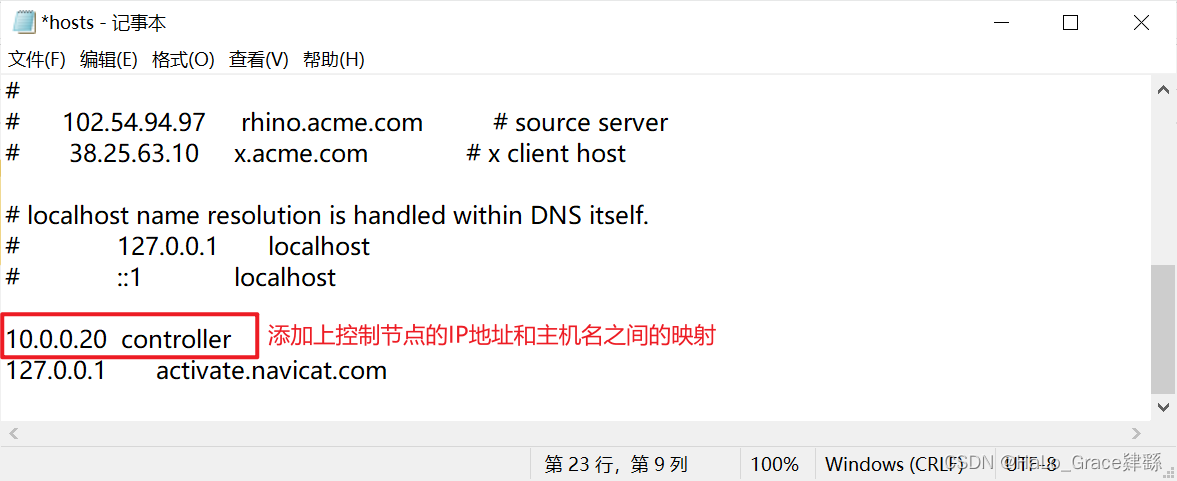 ②.添加上"控制节点IP地址 和控制节点的主机名",作为主机名和IP地址之间的映射文件