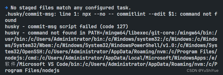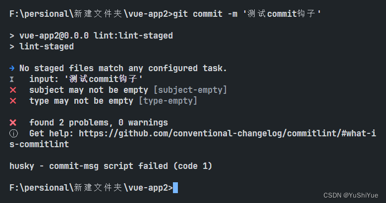 阐明我们的配置已经生效,可以看到提示我们sunject,type不能为空,修改一下git commit -m "feat: 规范的提交" 可以看到下面的图里没有了报错