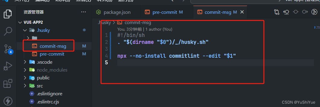 复制代码 运行完之后会在.husky中天生一个commit-msg文件,或者手动添加,直接把下面的命令拷贝到commit-msg当中