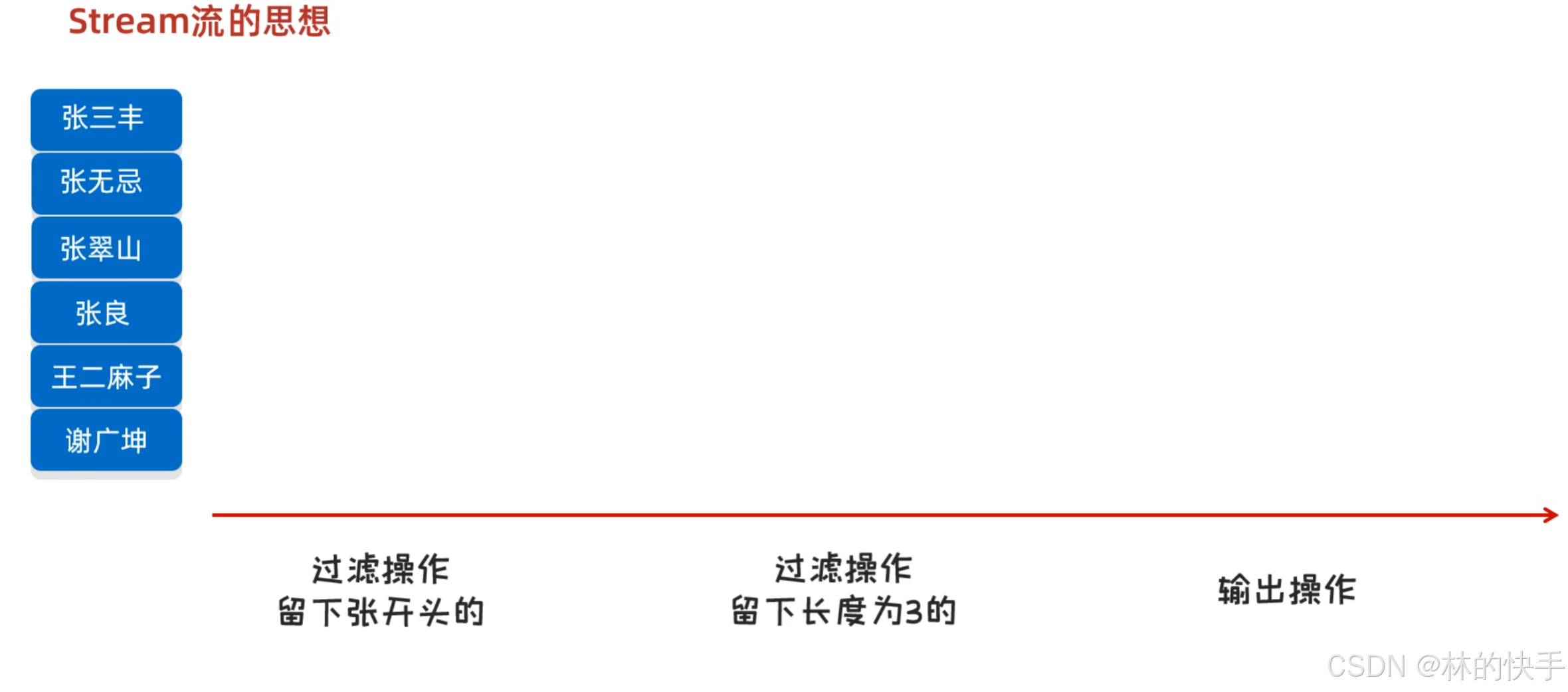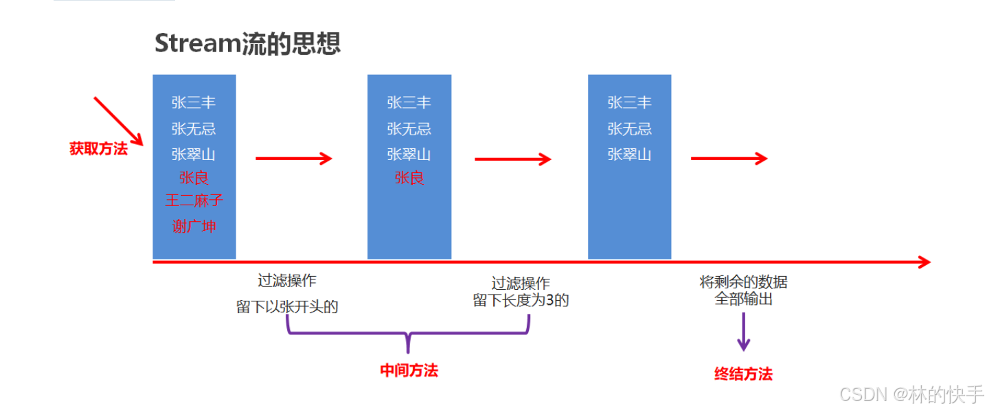 - list1.stream().filter(name->name.startsWith("张")).filter(name->name.length()==3).forEach(name-> System.out.println(name));