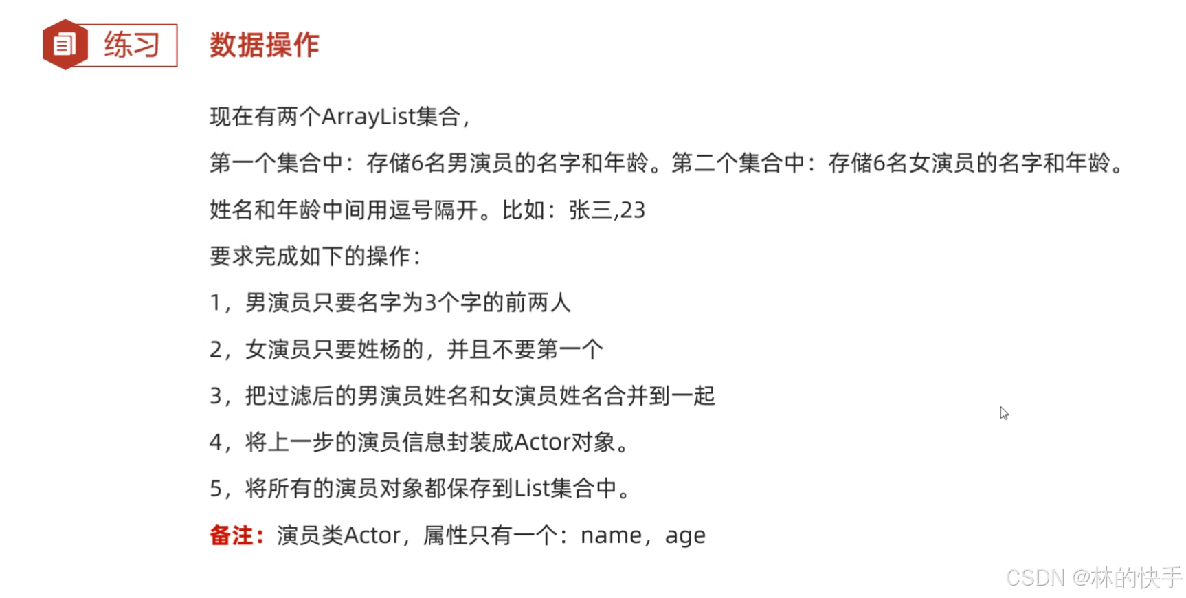 - 现在有两个ArrayList集合,分别存储6名男演员的名字和年龄以及6名女演员的名字和年龄。