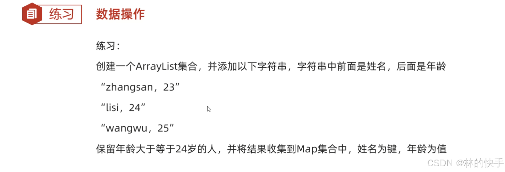 - Collections.addAll(manList, "蔡坤坤,24", "叶齁咸,23", "刘不甜,22", "吴签,24", "谷嘉,30", "肖梁梁,27");
