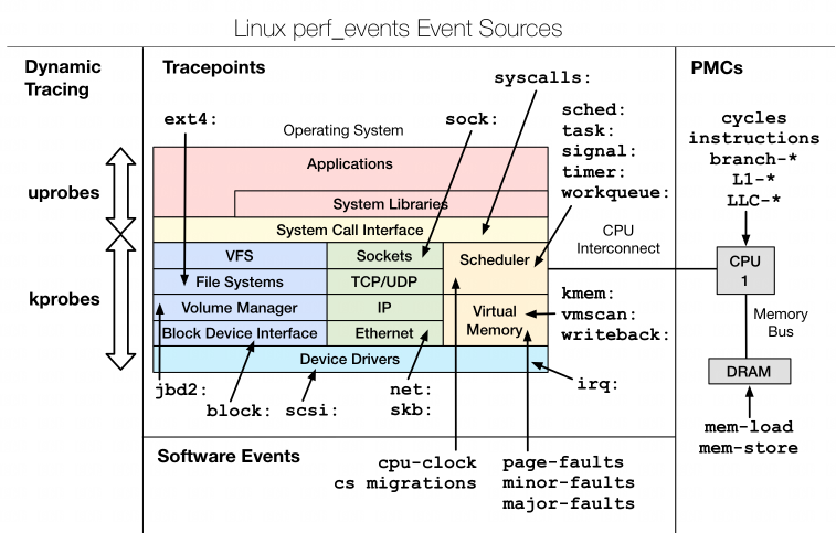 - 软件事件跟踪: 在内核和用户空间插入探针,跟踪软件事件的发生。