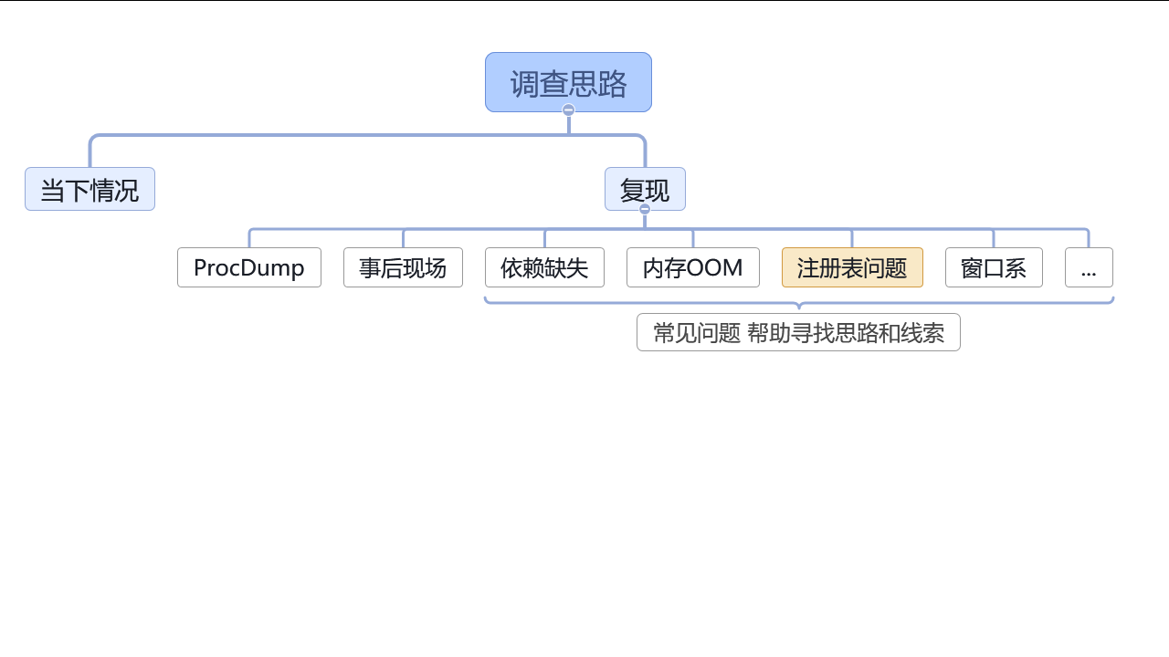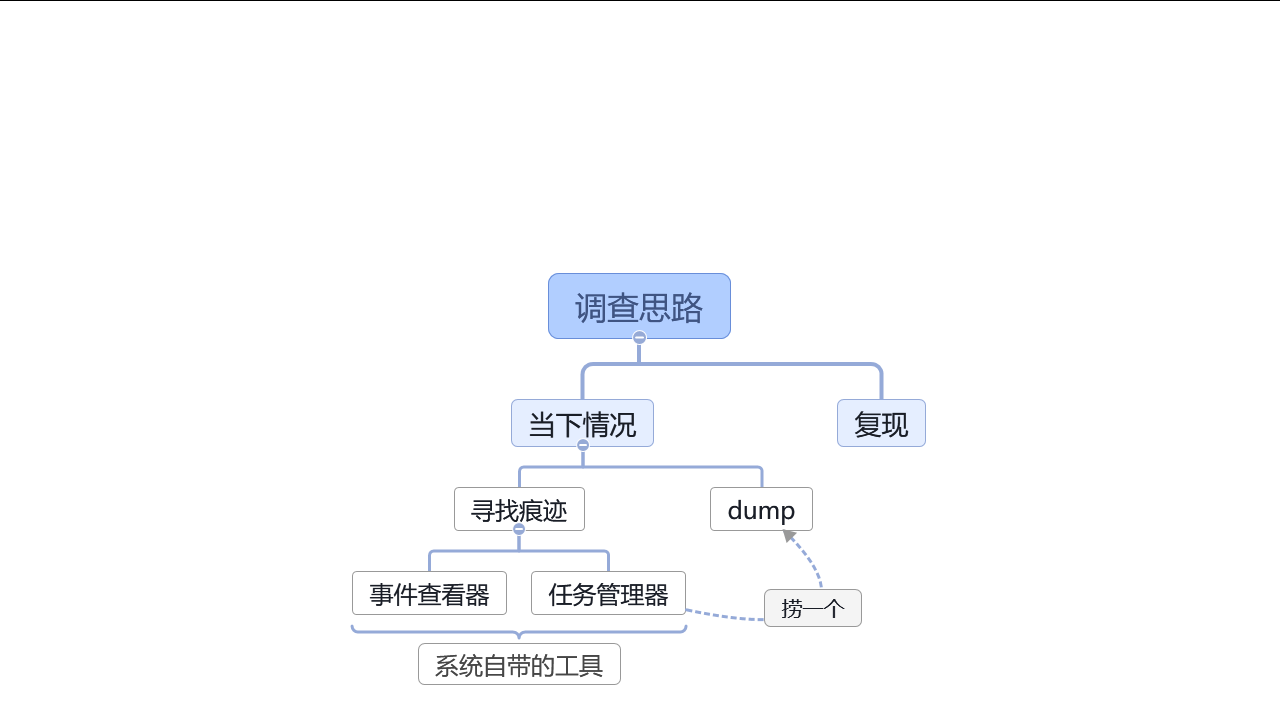 先回顾一下,咱的调查思绪一开始就是尝试寻找痕迹。寻找痕迹的时候借助 Windows 里面提供的好用的工具,这里重点介绍的是变乱查看器和任务管理器。通过变乱查看器可以快速的了解到软件崩溃的原因,通过任务管理器可以了解到软件的运行环境