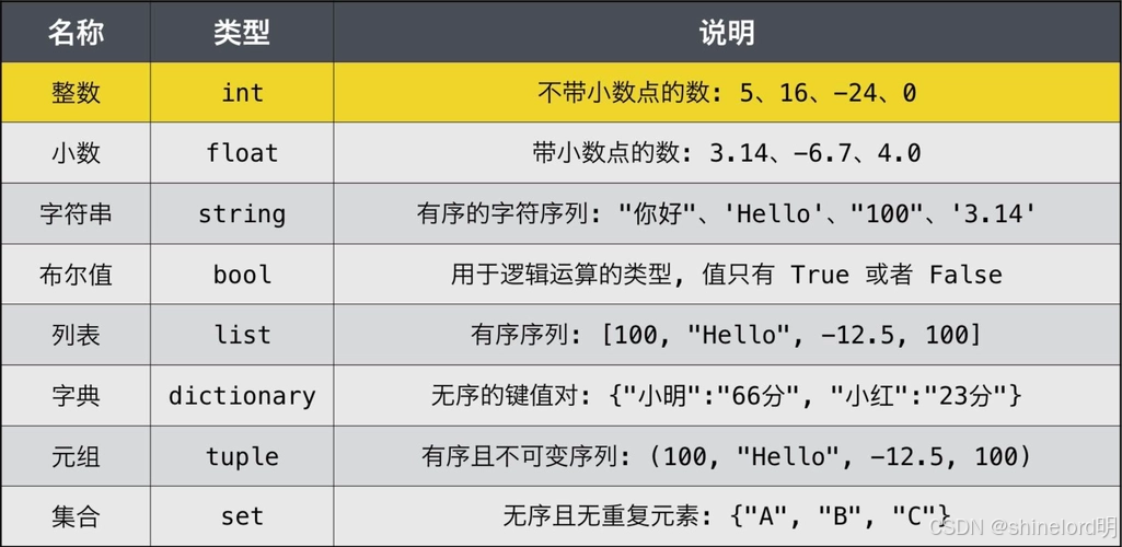数字:整数(int)、浮点数(float)、复数(complex)。