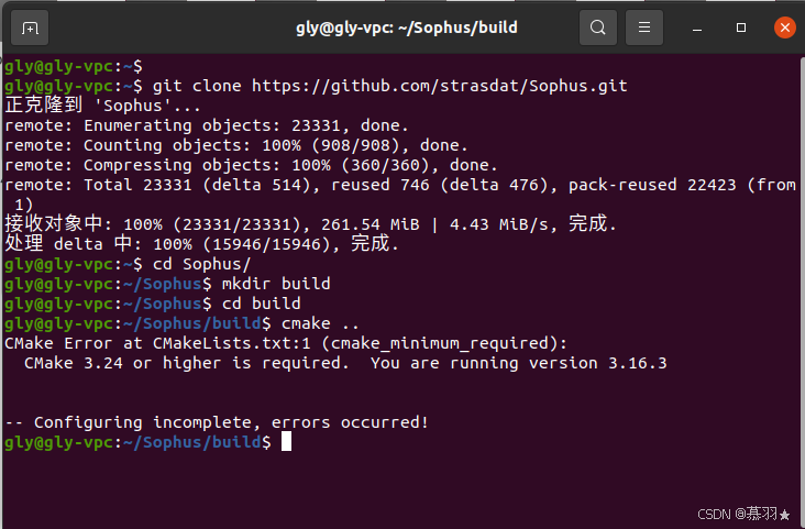 6、到这里CMake的升级就完成了,然后我们就可以继续举行Sophus的安装了,我们返回Sophus的build文件下,重新执行cmake