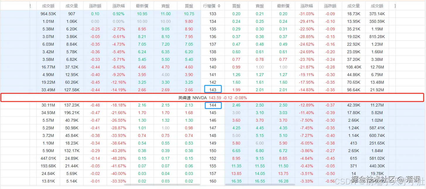 我以为这应该是这个表格最抓马的地方了,为什么呢,这个表格整体由三个表格组件横向排列形成的,以是想要横穿这三个表格放一个div,只能让它脱离文档流,去父相子绝的定位它。更恶心的地方是这个信息栏的位置是必要根据表格的数据去确定位置,如下图,信息栏中的数字是143.59,那它的位置就应该是在143和144之间。大佬们可以思索一下要怎么实现呢?