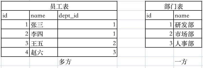 - 实现:在多的一方建立外键,指向一的一方的主键,这里员工表是多的的一方,部门表是一的一方