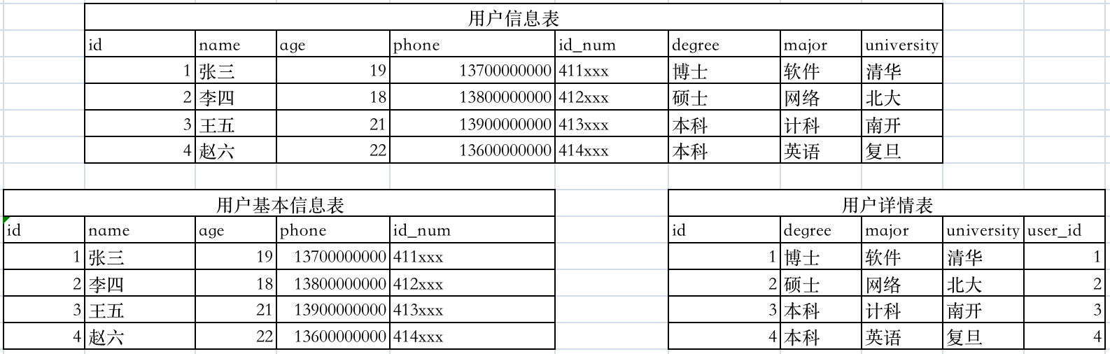 三、示例数据表结构及数据