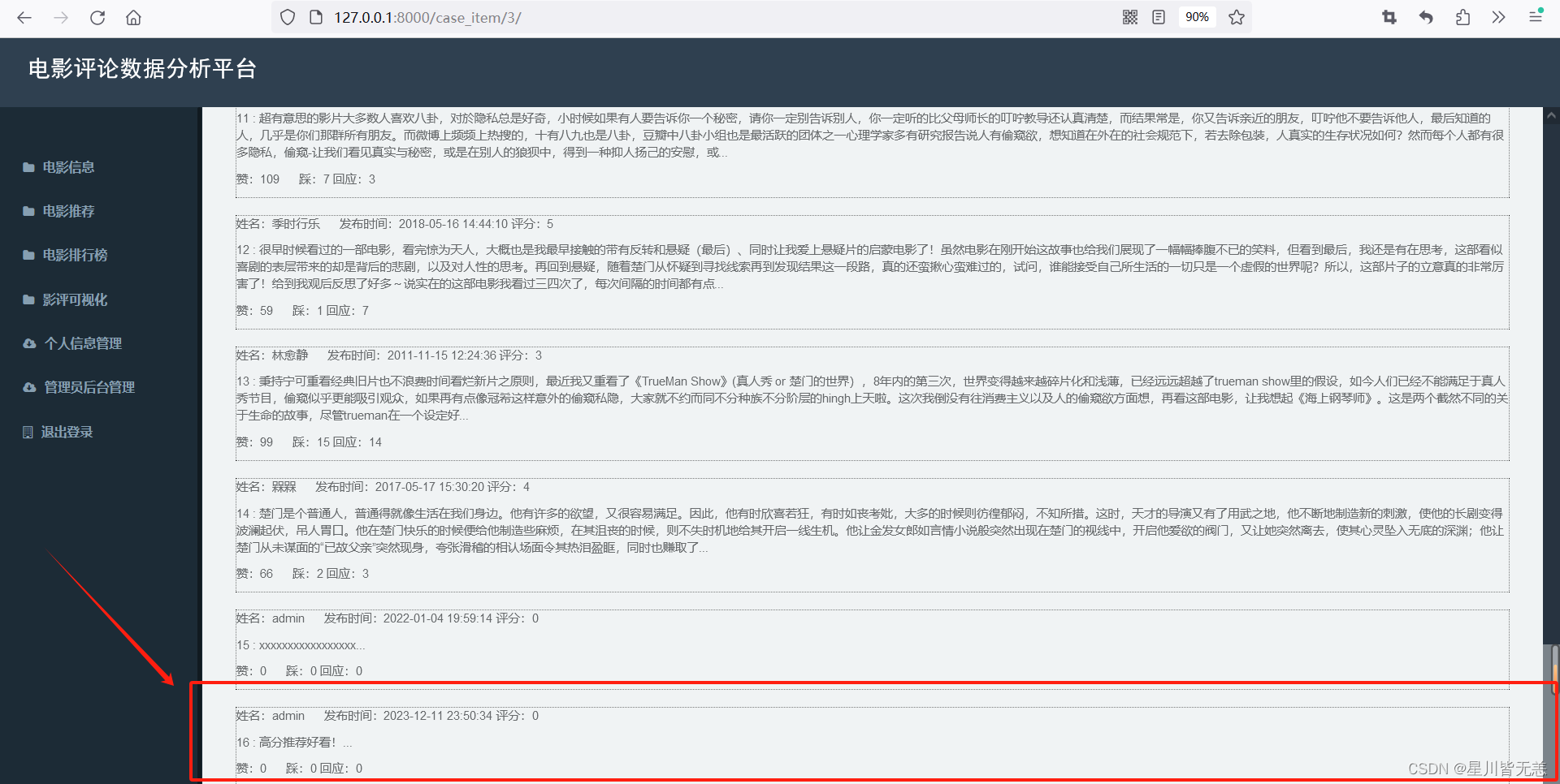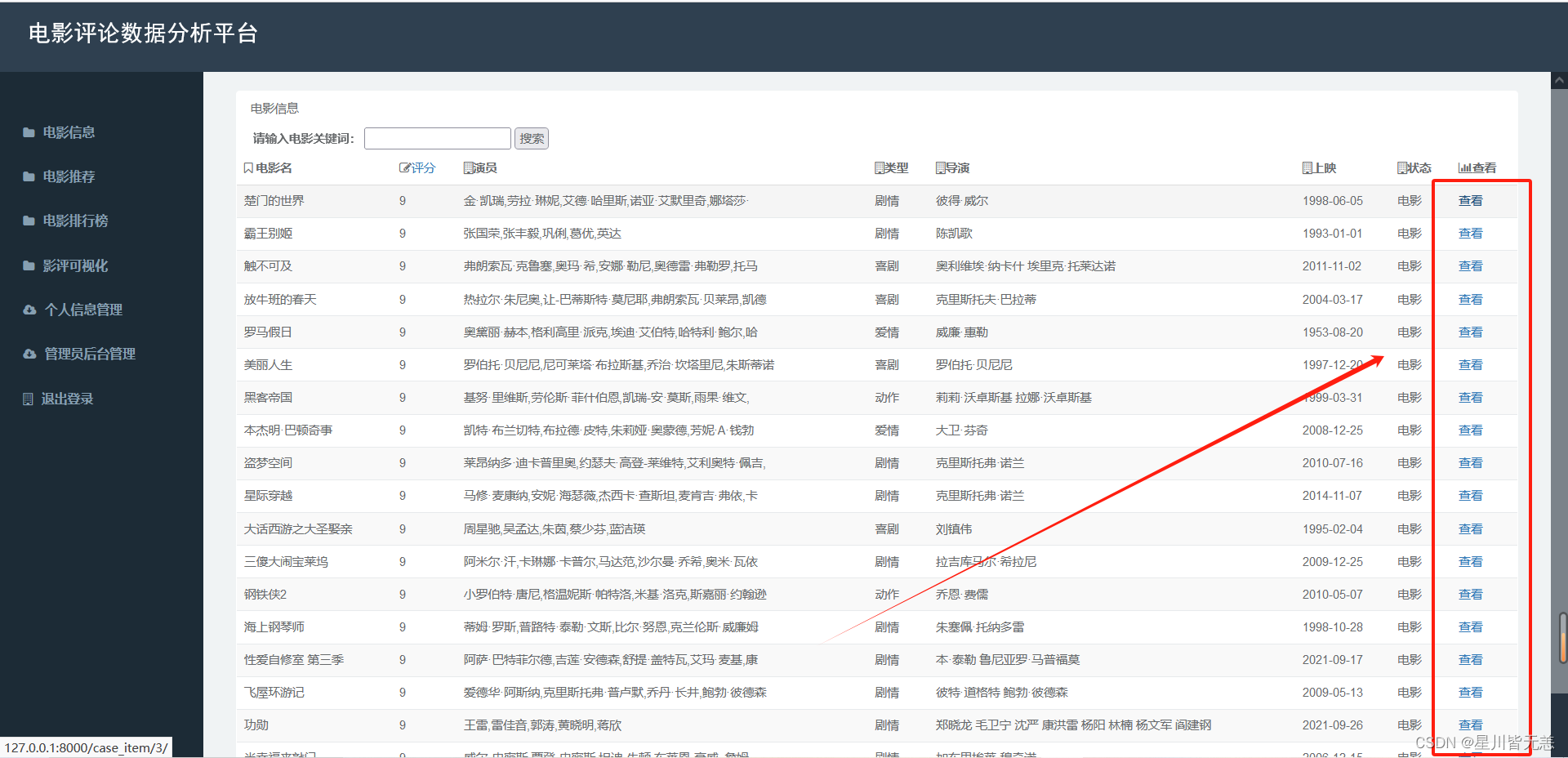 本项目选取豆瓣作为数据源,结合Python和Django等先进技能,构建了一个综合性的豆瓣电影批评可视化分析推荐系统。通过对大规模批评数据的采集和处置惩罚,我们可以或许深入挖掘用户的观影趋势、口碑评价等信息。在这个基础上,利用数据可视化技能,以直观的图表和图形展示用户的观影偏好,为用户提供了更深入的电影分析服务。