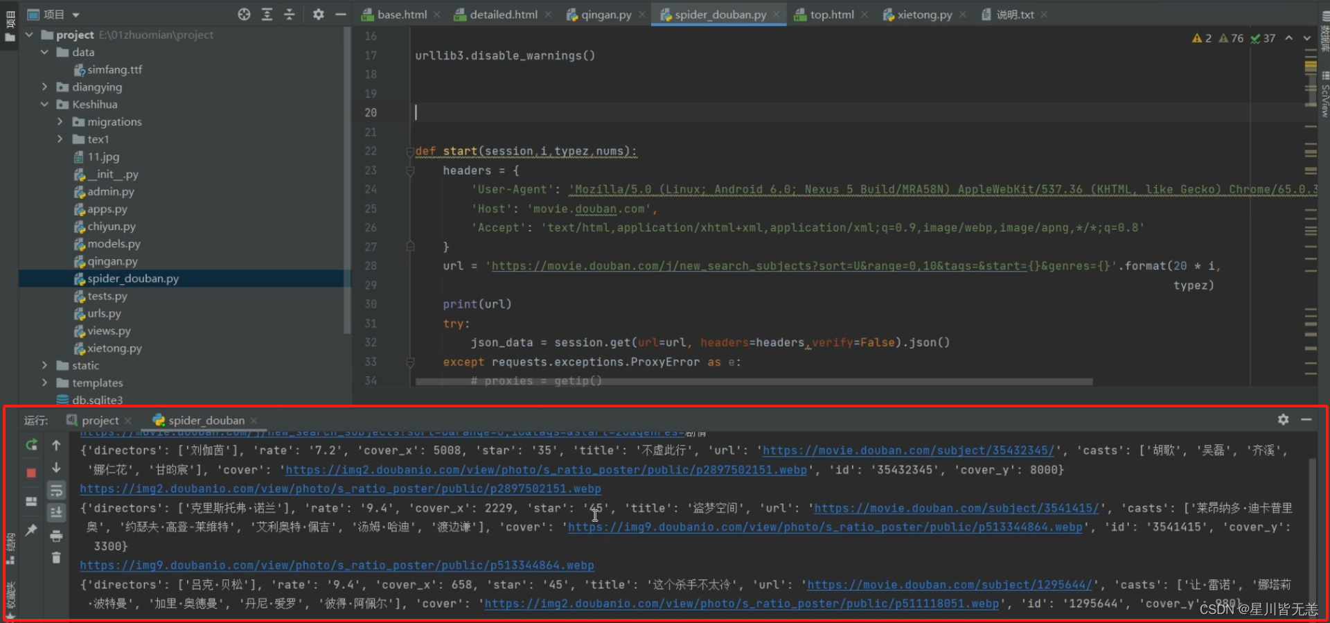复制代码 使用requests库发送GET请求,获取豆瓣电影网站的主页内容,并禁用了SSL证书验证(verify=False)。