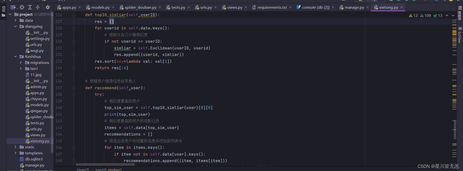 - 调用 top10_similar 方法找到与指定用户最相似的前4个用户中的第一个用户(相似度最高的用户)。