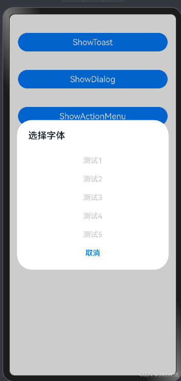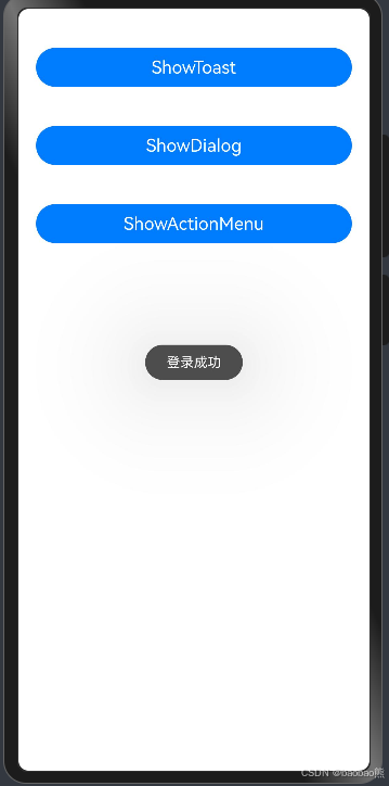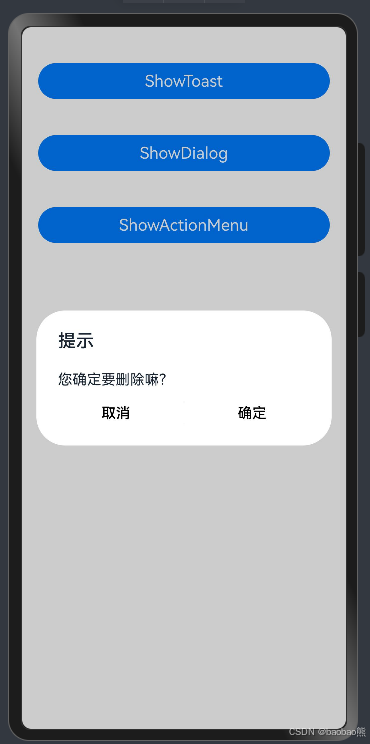 免责声明:如果侵犯了您的权益,请联系站长,我们会及时删除侵权内容,谢谢合作!更多信息从访问主页:qidao123.com:ToB企服之家,中国第一个企服评测及商务社交产业平台。复制代码import promptAction from '@ohos.promptAction';@Entry@Componentstruct Show_Page {  @State message: string = 'Hello World';  showToast() {    promptAction.showToast({      message: "登录成功", //显示内容      duration: 2000, //显示持续时间      bottom: 400//设置显示的距离底部位置    })  }  showDialog() {    promptAction.showDialog({      title: "提示",      message: "您确定要删除嘛?",      buttons: [        {          text: "取消",          color: "#000"        },        {          text: "确定",          color: "#000"        }      ]    }).then((data) => {      console.log(data.index.toString());    })  }  showActionMenu() {    promptAction.showActionMenu({      title: "选择字体",      buttons: [        {          text: "测试1",          color: "#ccc"        },        {          text: "测试2",          color: "#ccc"        },        {          text: "测试3",          color: "#ccc"        },        {          text: "测试4",          color: "#ccc"        },        {          text: "测试5",          color: "#ccc"        }      ]    }).then((data) => {      console.log(data.index.toString());    })  }  build() {    Column() {      Button() {        Text("ShowToast").fontColor(Color.White).fontSize(18)      }      .width("90%")      .height(40)      .margin({ top: 40 })      .onClick(() => {        this.showToast();      })      Button() {        Text("ShowDialog").fontColor(Color.White).fontSize(18)      }      .width("90%")      .height(40)      .margin({ top: 40 })      .onClick(() => {        this.showDialog();      })      Button() {        Text("ShowActionMenu").fontColor(Color.White).fontSize(18)      }      .width("90%")      .height(40)      .margin({ top: 40 })      .onClick(() => {        this.showActionMenu();      })    }    .height('100%')    .width('100%')  }}