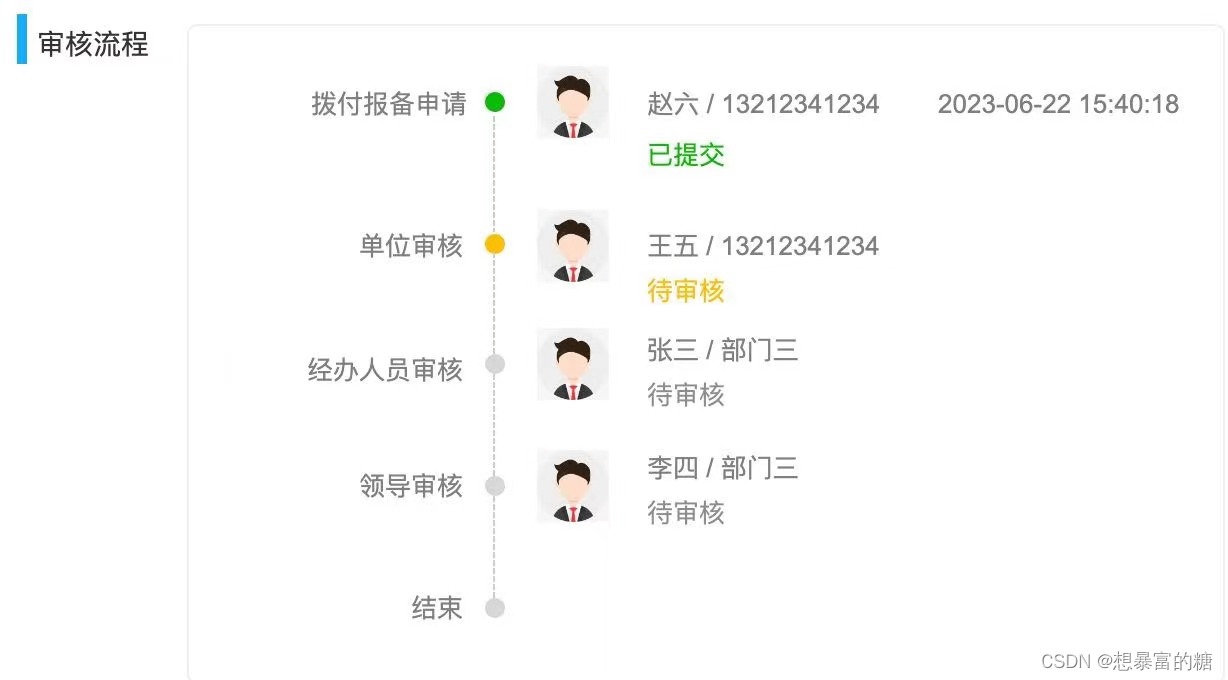复制代码 可根据后台数据举行得当修改,已适配待提交状态/待审批/审批中/已完结/退回等流程