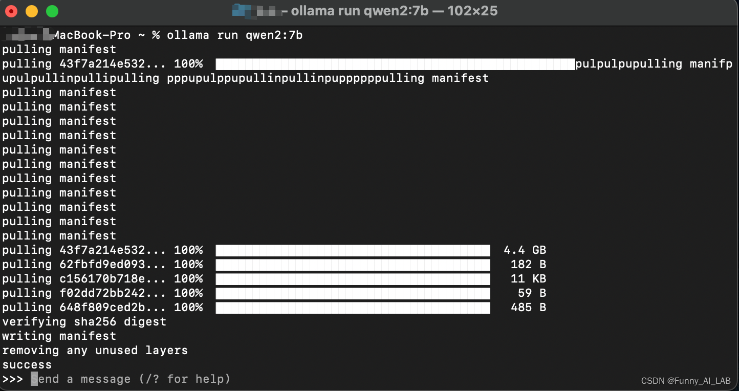 官网下载安装成功,打开终端安装:ollama run qwen2:7b