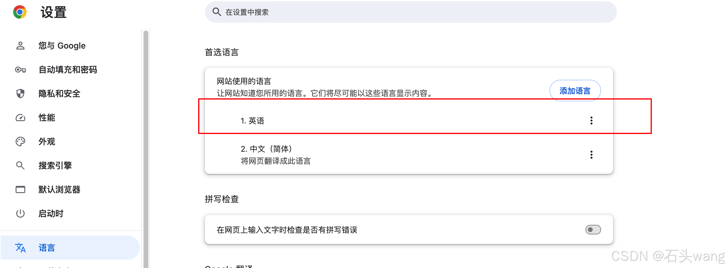 在语言里添加"英语"而且置顶,试了很久,设置完后重启浏览器什么的,都无法改成英文。