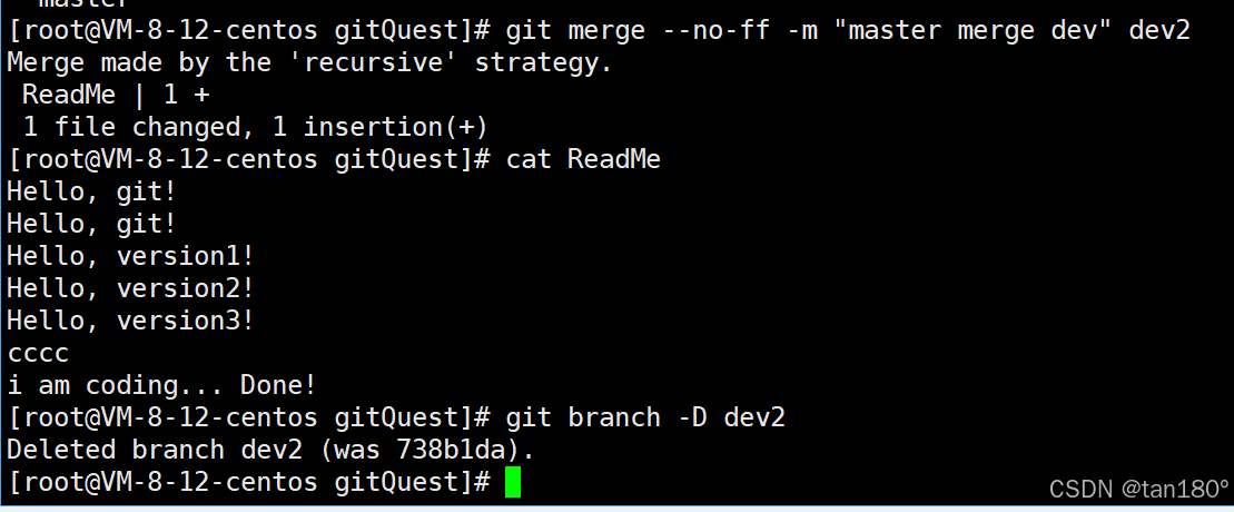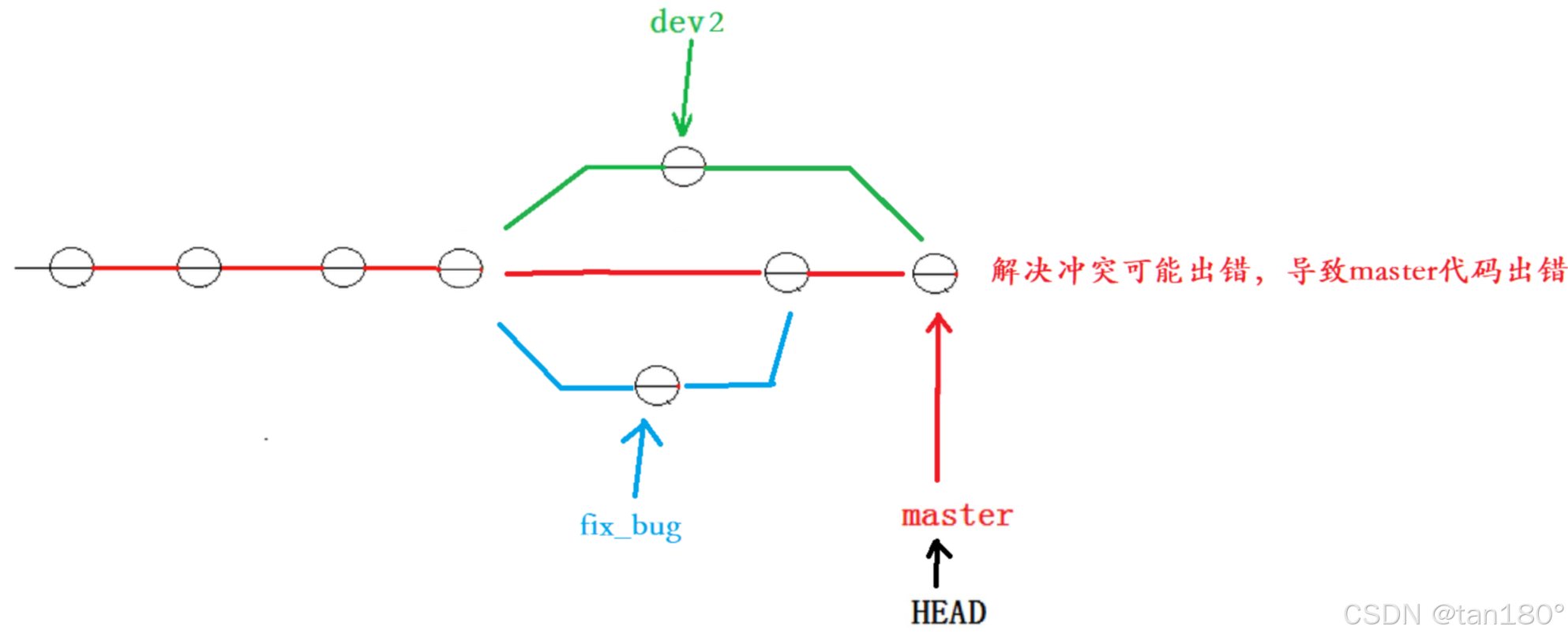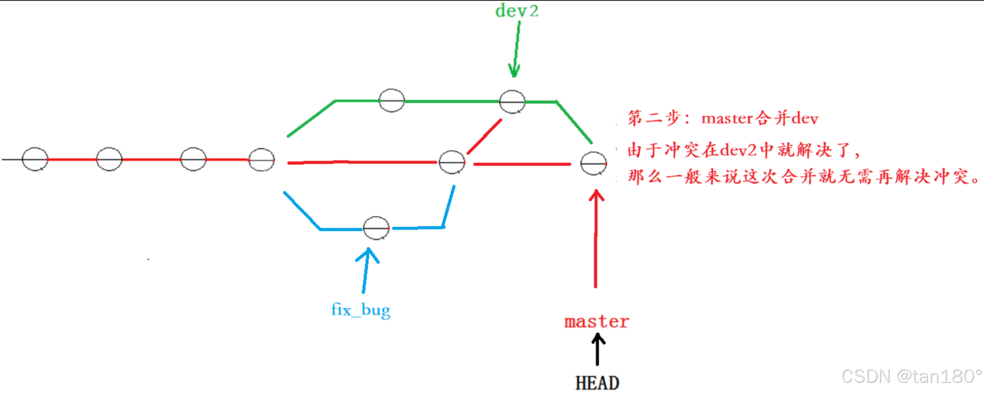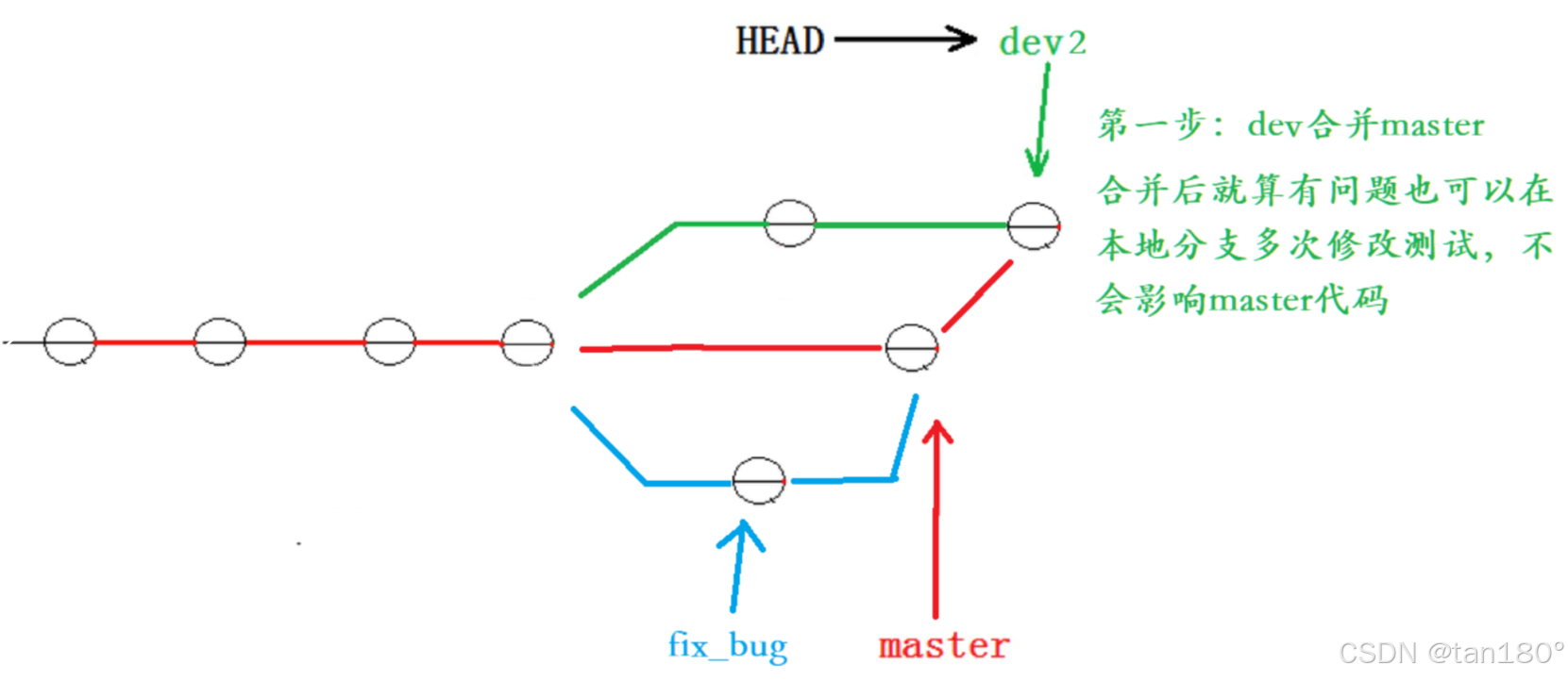 我们的终极目标是要让 master 合并 dev2 分支的,那么正常情况下我们切回 master 分支直接合并即可,但如许实在是有一定风险的。