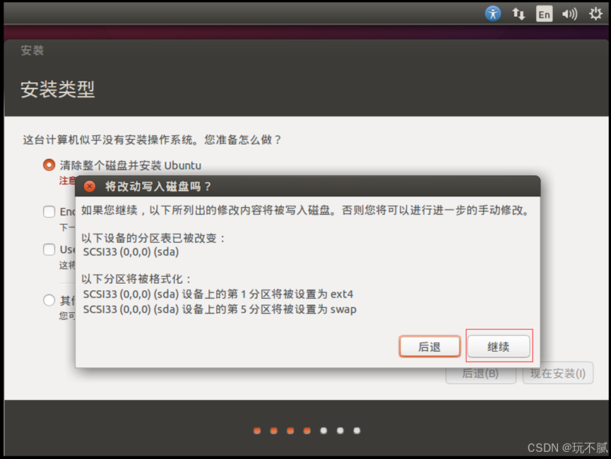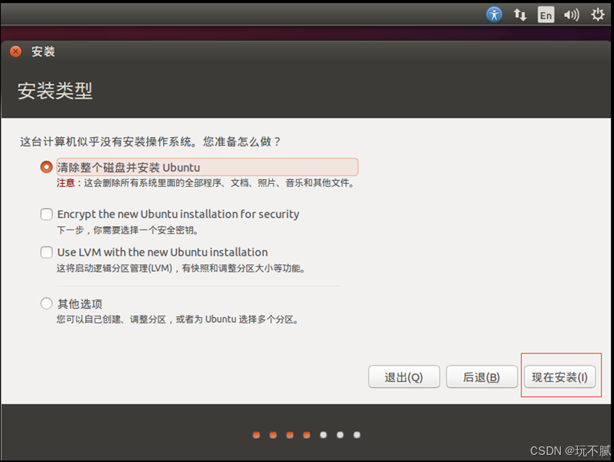 2.安装类型,选择清除整个磁盘并安装ubuntu