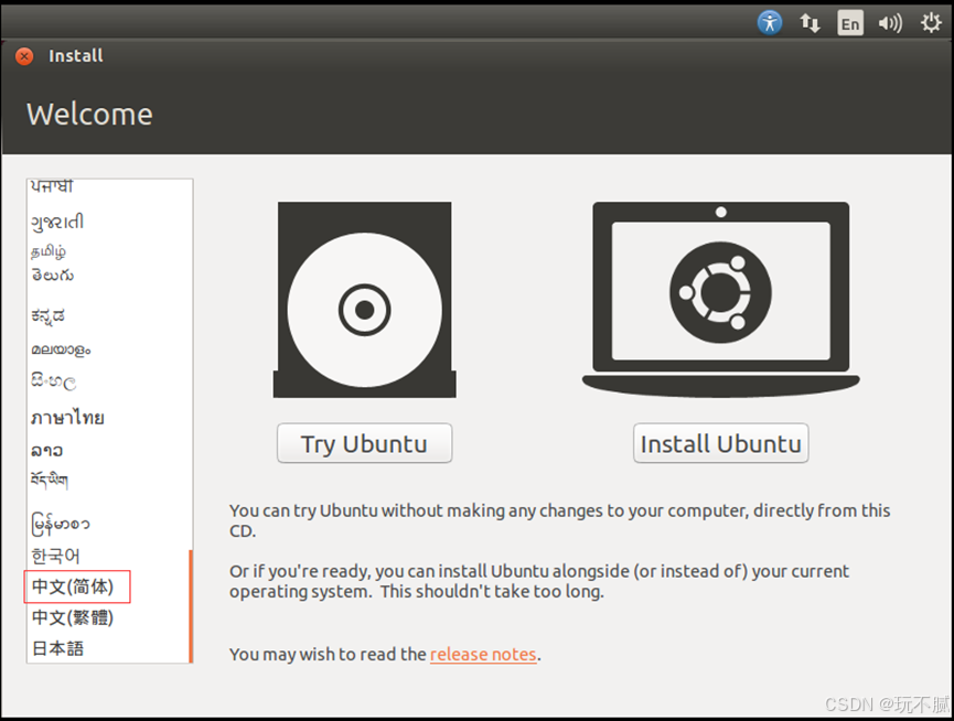然后就会来到如下界面,我们选择中文简体(演示使用,正常安装请使用默认英文版)点击Install Ubuntu: