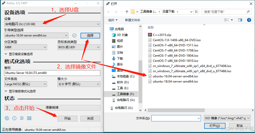按照图解依次 选择U盘 – 选择镜像文件 – 开始制作U盘。