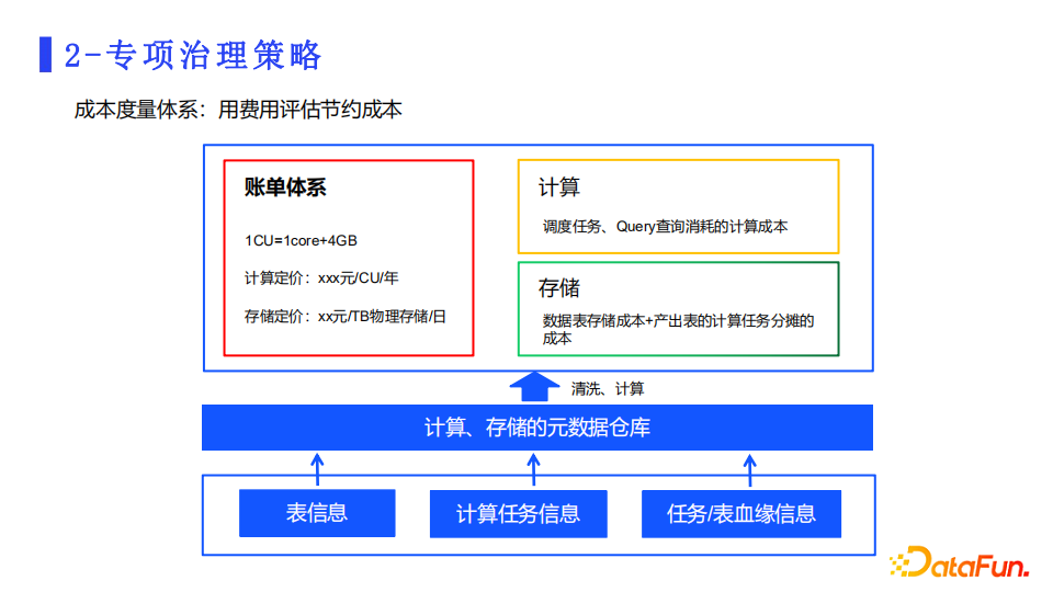 上图是成本度量体系的设计。红色线框中是账单体系,定义了成本的算法,让用户轻松理解自己的账单费用。黄色线框中是计算成本模块,根据规则把调度执行的计算成本算好形成账单。绿色线框中会算出存储成本。上边的