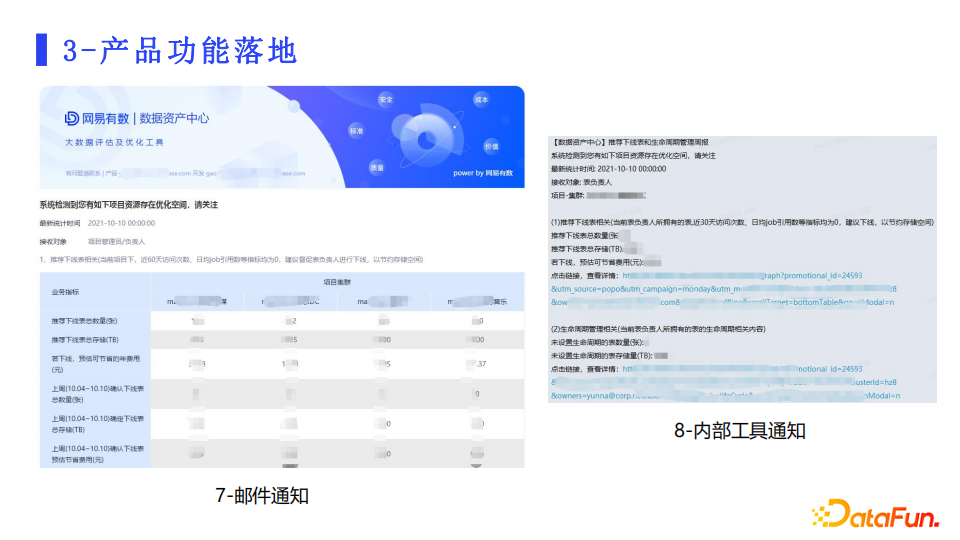 邮件通知 & 内部工具通知:通知内容分为了两个视角,一方面是治理负责人,可以了解当前自己还有哪些数据需要进行治理,治理后可以给项目节省多少年费用;另一方面是项目的管理员/负责人,可以知道当前项目下一共还有多少数据需要治理,治理后总共可以节省多少年费用,也可以知道整个项目中治理做的好的负责人Top5,以及还有哪些人占据的成本最多,可以以此为依据,催促负责人进行治理工作。
