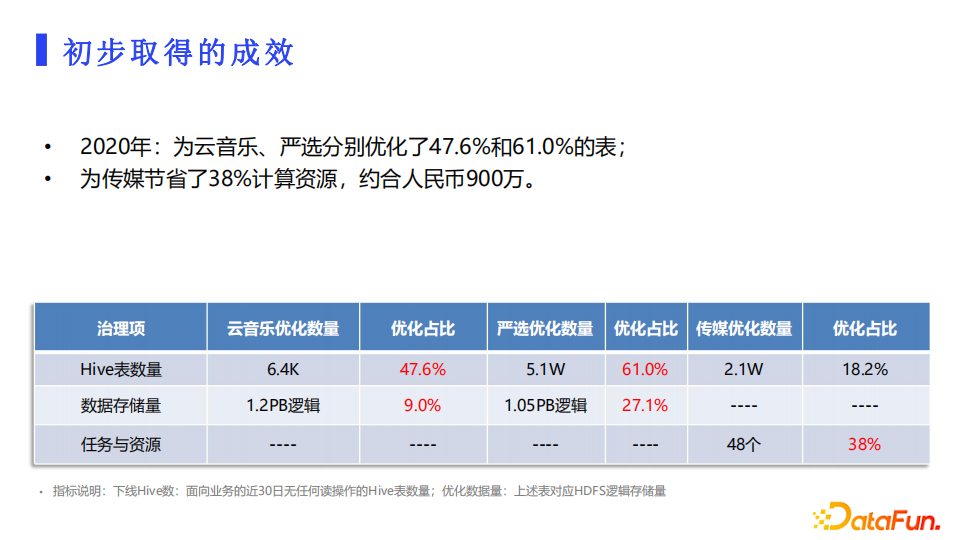 从下图中可以看到我们的治理成果数据。通过上述的多种策略,初步取得了治理成效。2020年,为云音乐和严选分别优化了47.6%和61%的表,也为传媒业务线节省了约38%的计算资源,数据治理各个业务线的专项活动策略得到了业务方的肯定。