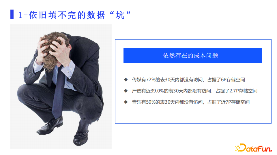 当前我们依然面临成本问题,对于历史数据较多的公司,数据治理需要一个过程。这个过程“前路漫漫,道阻且长”,我们亟待解决的几方面问题包括存储成本、计算成本、数据质量、模型规范、数据