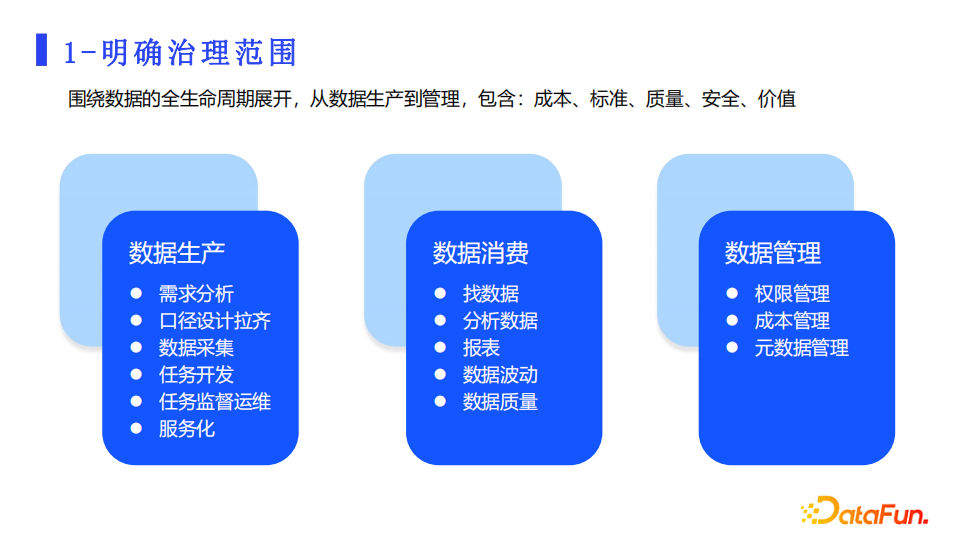 我们围绕数据生命周期,从生产、消费到管理来梳理治理的范围。在数据生产阶段,需要对需求进行分析,明确业务口径,对数据进行规范采集、任务开发和